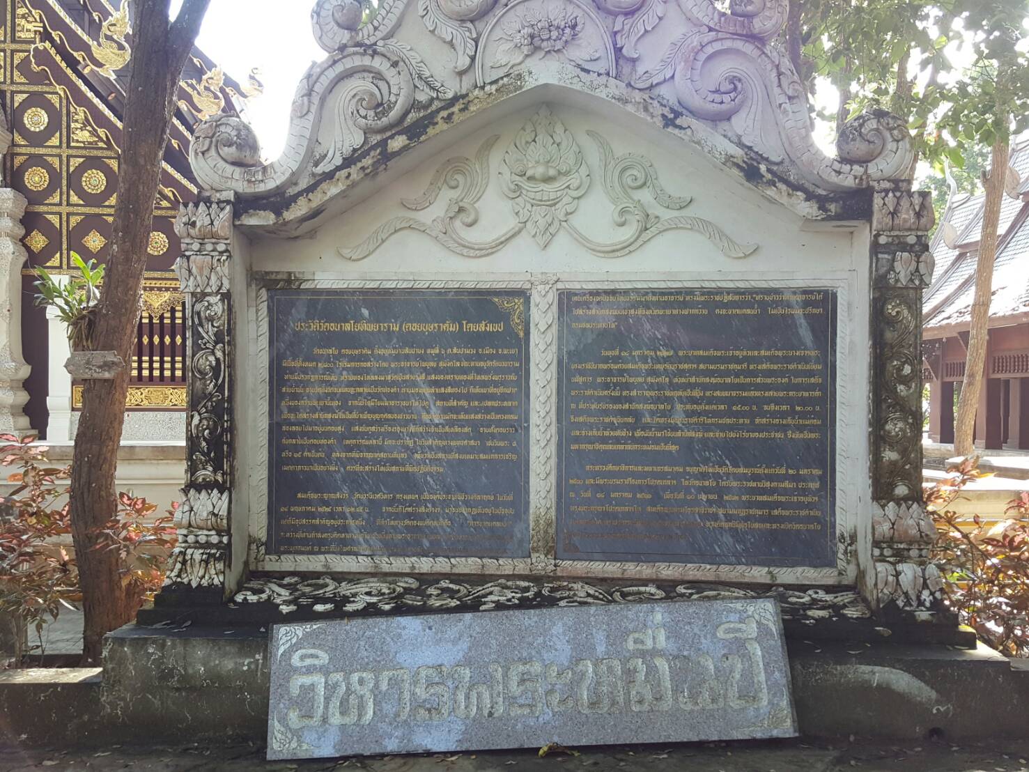 หน้าวิหารพระหมื่นปี มีป้ายบอกประวัติการก่อสร้างของวัดไว้ แต่ไม่บอก พ.ศ.ที่สร้างและไม่บอกวัตถุประสงค์ที่แท้จริงว่า แนวคิด (Concept) ในการสร้างวัดเป็นอะไร เพราะมีเทพทั้งของพุทธและพราหม์อยู่ด้วย