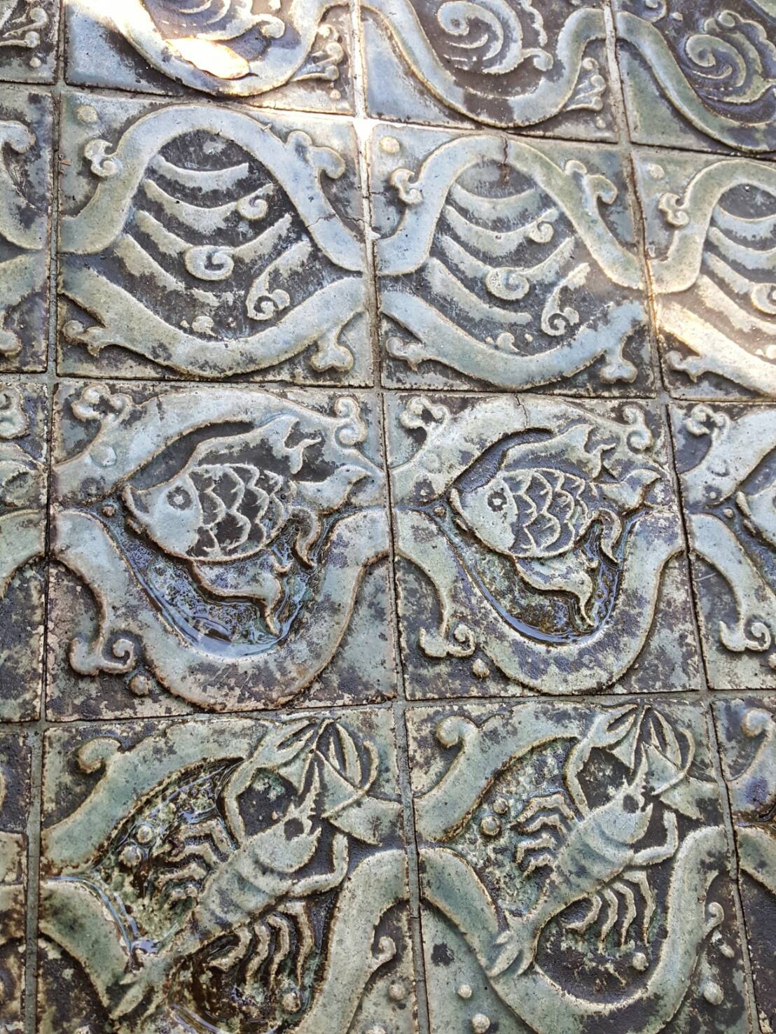 การสร้างเจดีย์ก็แปลก รวมถึงพื้นด้านล่างเจดีย์ก็เป็นกระเบื้องเล็กๆ ลายปลา กุ้ง คลื่นน้ำ เรียงอยู่อย่างเป็นระเบียบ