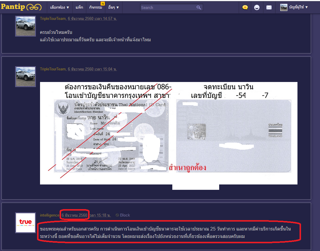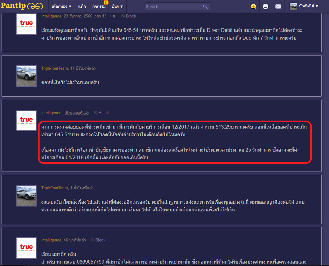 เมื่อเดือนธันวาปี 2560 มียอดค้างชำระกับทางทรู 1153 เลยรีบชำระผ่านบัตรเครดิตไปก่อนเพราะกลัวจะใช้งานไม่ได้ แต่ทำระบบหักผ่านบัตรเครดิตอัตโนมัติไว้ด้วย พอถึงเวลาก็โดนตัดอีกรอบ เลยโทรไปสอบถามและได้สอบถาม Call Center ที่พันทิบได้ความว่าสามารถแจ้งผ่านระบบนี้ได้เลย แต่ต้องรอ 25 วัน ซึ่งถือว่านานมาก แต่ไม่เป็นไรผมรอได้ จะเอาเงินผมไปค้างไว้ตั้ง 1000
