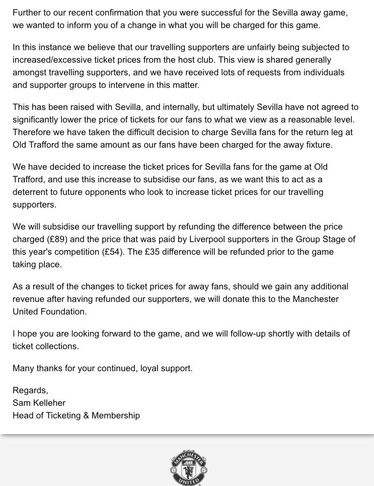 หลังจากที่สโมสร Sevilla ในสเปนขายตั๋วเข้าชม UEFA Champions League รอบแบ่งกลุ่มที่สนาม Ramon Sanchez Pizjuan Stadium กับแฟนบอล Liverpool ที่ 54 ปอนด์หรือ 2,347 บาท แต่เมื่อมีนัดแข่งรอบ 16 ทีม กับ Manchester United สโมสร Sevilla ได้ตั้งราคาสำหรับแฟนบอลของ Manchester United ถึง 89 ปอนด์หรือ 3,896 บาท และแฟนบอลได้ร้องขอให้ Manchester United ช่วยจ่ายค่าตั๋วในส่วนต่างของราคา