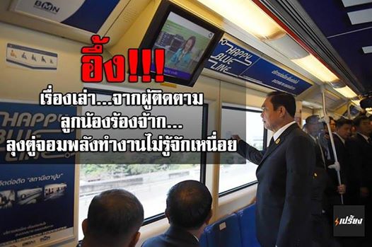 ผู้สื่อข่าวรายงานว่า เพจ "เปรี้ยง" ได้เปิดเผยเรื่องราวจากข้าราชการคนหนึ่งที่ติดตาม พล.อ.ประยุทธ์ จันทร์โอชา นายกรัฐมนตรีและหัวหน้าคณะรักษาความสงบแห่งชาติ (คสช.)ในการลงพื้นที่พบปะประชาชน โดยระบุข้อความว่า "อึ้ง!!! เรื่องเล่า…จากผู้ติดตาม ลูกน้องร้องจ๊าก… ลุงตู่จอมพลัง ทำงานไม่รู้จักเหน็ดเหนื่อย