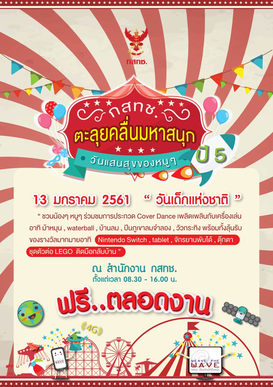 ชวนน้องๆ หนูๆ ร่วมชมการประกวด Cover Dance เพลิดเพลินกับเครื่องเล่น อาทิ ม้าหมุน, waterball, บ้านลม, ปีนภูเขาลมจำลอง, วัวกระทิง พร้อมทั้งลุ้นรับของรางวัลมากมายอาทิ Nintendo Switch, tablet, จักรยานพับได้, ตุ๊กตา, ชุดตัวต่อ LEGO ติดมือกลับบ้าน ณ สำนักงาน กสทช. ตั้งแต่เวลา 08.30-16.00 น.