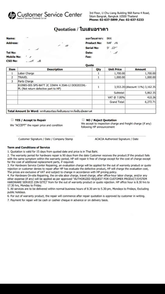 ยังไม่ยอมแพ้นะคะ ด้วยความเสียดายที่เราซื้อมาแล้วก็พยายามไปสอบถามร้านอื่นเผื่อมีอะไหร่ ในย่านดัง เขาบอกว่ารุ่นนี้เฉพาะมาก ต้องศูนย์เท่านั้น อีกร้านนึงให้ความหวังเราว่า ต้องรอนำเข้า ให้รอ 2 เดือน ตอนนี้รอมาครบแล้วค่ะ 2 เดือนกว่าแล้ว กลับไปถาม เขาบอกว่าติดปัญหาเรื่องการนำเข้า เพราะรุ่นนี้เป็นแบตพิเศษ การนำเข้าค่อนข้างมีปัญหา เลยแนะนำให้ไปศูนย์โลด แต่ไปศูนย์โลด ก็ 6000 กว่าค่ะ ตามภาพ