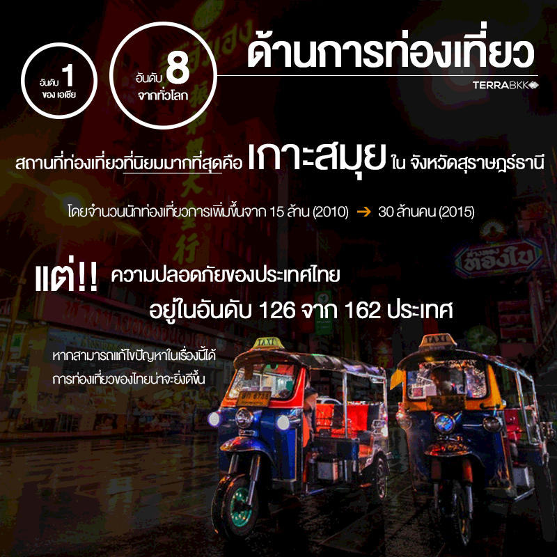 แต่ที่ยังน่าเป็นห่วงคือเรื่องอันดับความปลอดภัยของประเทศซึ่งประเทศไทยยังอยู่ในอันดับที่ไม่ค่อยดี โดยจากข้อมูลของสถาบันเศรษฐศาสตร์และสันติภาพ ซึ่งได้ทำการจัดอันดับประเทศที่ปลอดภัยที่สุดในโลกจากประเทศทั้งหมด 162 ประเทศ โดยพิจารณาระดับความปลอดภัยจาก อัตราการเกิดอาชญากรรมต่ำ, ระดับอาชญากรรมรุนแรง, จำนวนประชากรคุก, การรักษาความปลอดภัยในสังคม, ไม่มีภัยพิบัติทางธรรมชาติ, การทุจริตคอรัปชั่นน้อย และการแก้ปัญหาต่างๆ ได้อย่างรวดเร็ว ประเทศไทยถูกจัดอันดับอยู่ที่ 126 จากประเทศทั้งหมด ซึ่งถือว่าอยู่ในโซนที่มีความปลอดภัยต่ำ ถ้าหากสามารถแก้ไขปัญหาในเรื่องนี้ได้สถานการณ์การท่องเที่ยวของไทยน่าจะยิ่งดีขึ้นกว่าเดิม เพราะในปัจจุบันตัวเลขนักท่องเที่ยวต่างชาตินั้นก็มีการเพิ่มขึ้นอย่างต่อเนื่องโดยเพิ่มขึ้นจากประมาณ 15 ล้านคนในปี 2010 มาถึงประมาณ 30 ล้านคน ในปี 2015