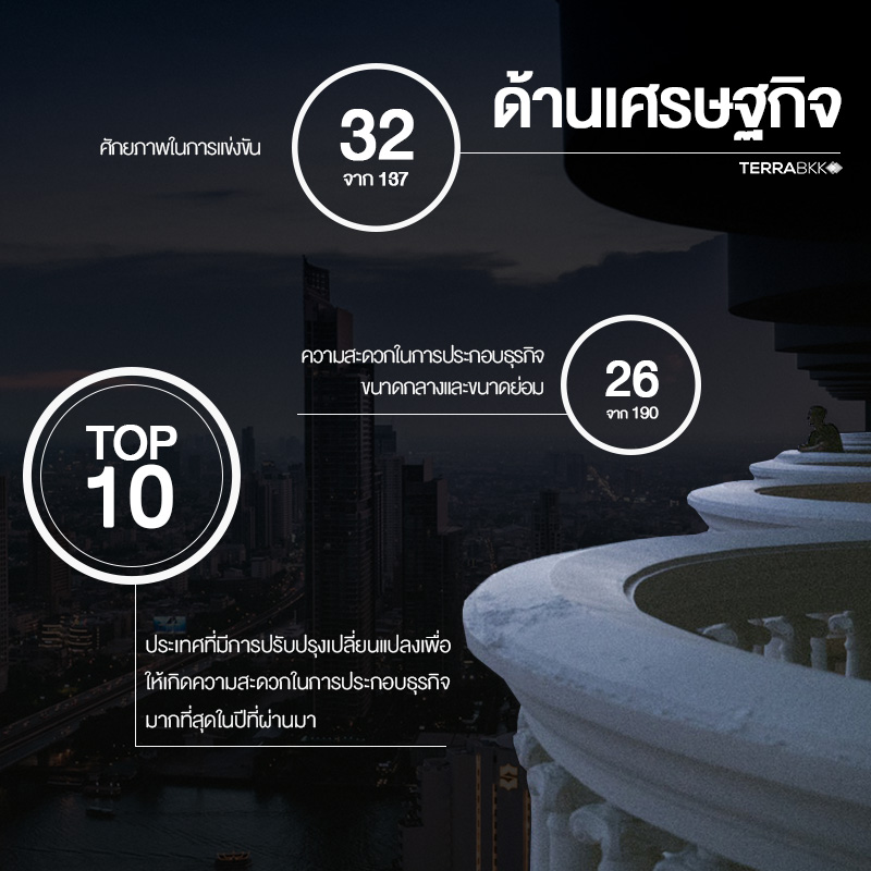 นอกจากนี้ประเทศไทยยังถูกจัดเป็น 1 ใน 10 ประเทศที่มีการปรับปรุงเปลี่ยนแปลงเพื่อให้เกิดความสะดวกในการประกอบธุรกิจมากที่สุดในปีที่ผ่านมา โดยเห็นได้ชัดจากตัวอย่างเช่น การยกเลิกข้อบังคับที่ต้องมีตราประทับของบริษัท และยกเลิกขั้นตอนการขออนุมัติจากกรมแรงงานในการส่งกฏข้อบังคับเกี่ยวกับการทำงานของบริษัท ดังนั้นการเริ่มต้นธุรกิจจึงใช้เวลาดำเนินงานเพียง 4.5 วัน เปรียบเทียบกับจากเดิม 27.5 วันในปีก่อน