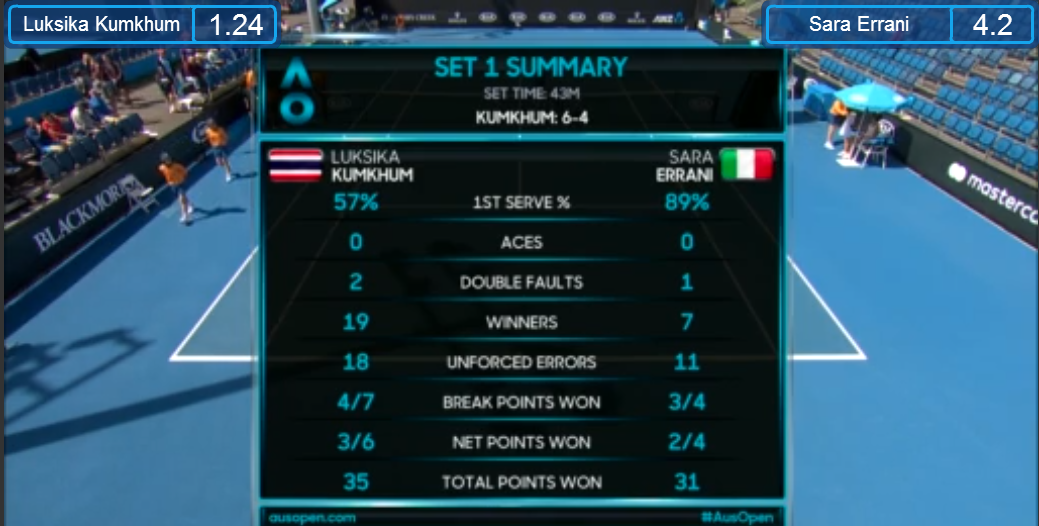 ศึกเทนนิสแกรนด์สแลมแรกของปี "ออสเตรเลี่ยน โอเพ่น 2018" ที่เมลเบิร์น พาร์ค ประเทศออสเตรเลีย หญิงเดี่ยว รอบคัดเลือกรอบสาม เมื่อช่วงเช้าที่ผ่านมา ลักษิกาอาศัยความหนักหน่วงในการยิงวินเนอร์ เอาชนะ Sara Errani มืออันดับ 144 ของโลก จากอีตาลี่ 2-0 Set 6-4 6-1 ผ่านเข้าสู่รอบเมนดรอว์ได้สำเร็จ Match stat ไม่โชว์ซะอย่างนั้น แต่เออเรอร์ทั้งคู่กระจุยกระจายมากๆ ลักเทิร์นเสิร์ฟได้โอเค แต่วันนี้เสิร์ฟไม่ค่อยดีเท่าไหร่