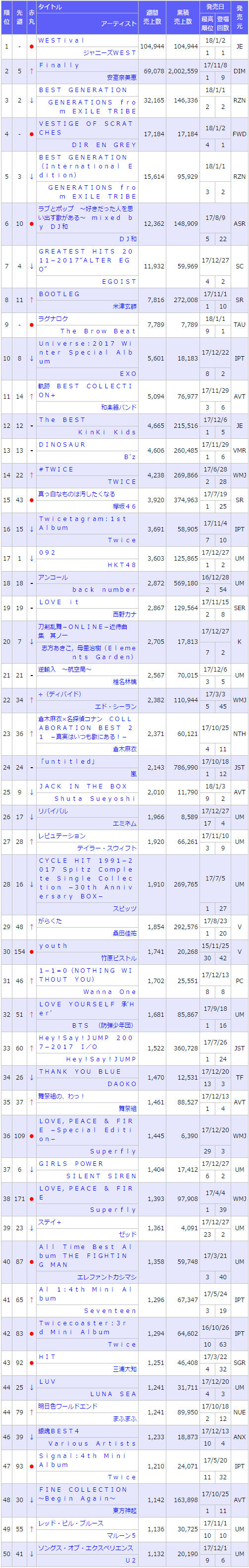 วงไอดอล Johnny's WEST ในสังกัดค่าย Johnny & Associates วางขายอัลบั้มชุดที่ 4 กับอัลบั้ม『WESTival』(วางขายวันที่ 2 มกราคมที่ผ่านมา) ขายไปได้ 104,944 แผ่น ขึ้นสู่อันดับหนึ่งของโอริคอนชาร์ทอัลบั้มรายสัปดาห์และเป็นอัลบั้มอันดับหนึ่งเป็นอัลบั้มที่สี่