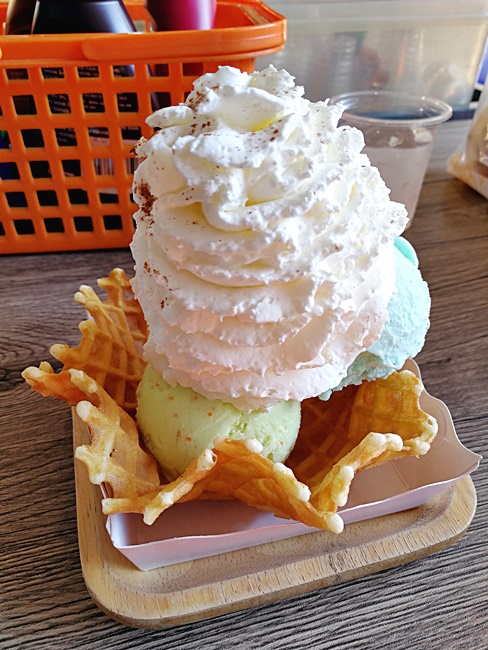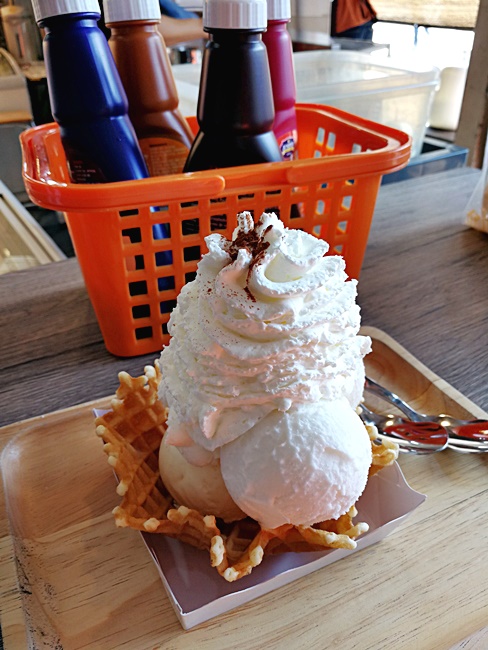 ปิดท้ายด้วยไอติมร้าน ฟาร์มมิลค์ ไอศกรีมนมสด สั่งแบบ 3 ลูก (105 บาท) และ 2 ลูก (80 บาท) มากิน แบบ 3 ลูกเลือกรสนมสด มะนาว โยเกิร์ตยาคูลท์ ส่วน 2 ลูกเลือกรสวาซาบิไข่กุ้ง (เป็นรสที่แปลกมาก) และช็อคมิ้นท์ โดยรวม ๆ อร่อยดี ไอติมมีรสชาติกำลังดี ไม่หวานเกินไป ที่ดีมากคือวาฟเฟิลทำให้ใหม่ ๆ กรอบดี