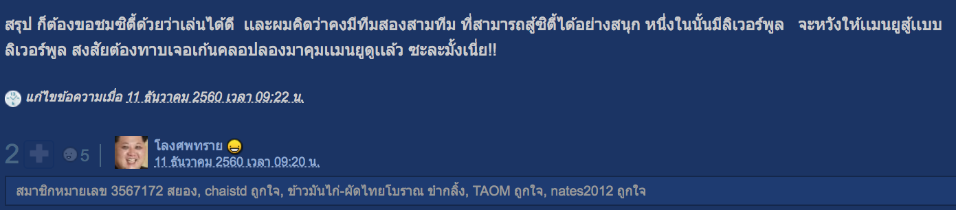 ส่วนตัวชื่นชอบวิธีการบุกเเบบไม่คิดชีวิตเเบบ หงส์เเดงนี่เเหละ ย้อนมากล่าวถึงเเมนยูตอนที่เเพ้ซีตี้ไป มีอยู่ช่วงนึงที่เเมนยูโหมเอาคืน พวกเค้าก็ทำได้ เเต่ไม่ยอมทำไปให้ตลอด เเต่กลับอุดรอโดน เเล้วก้โดนจริงๆ ซึ่งนั่นผมไม่เห้นด้วย ถ้าบุกเเล้วทำให้ซิตี้กลัวบ้าง เค้าก็จะถอยๆลงไปเอง เค้าก็ต้องระมัดระวังหลังอย่างหนักอยุ่เเล้ว ถ้าคิดสู้ก็ทำได้
