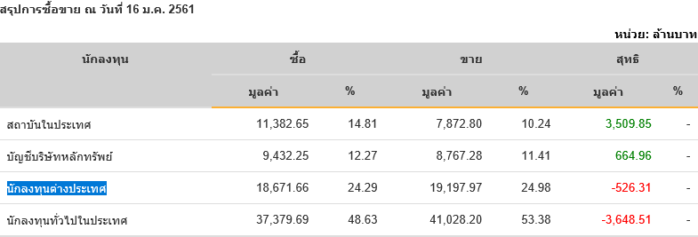 Sinthorn Summary 16/1/2561 : ต่างชาติขายสุทธิ -526.31 ลบ.