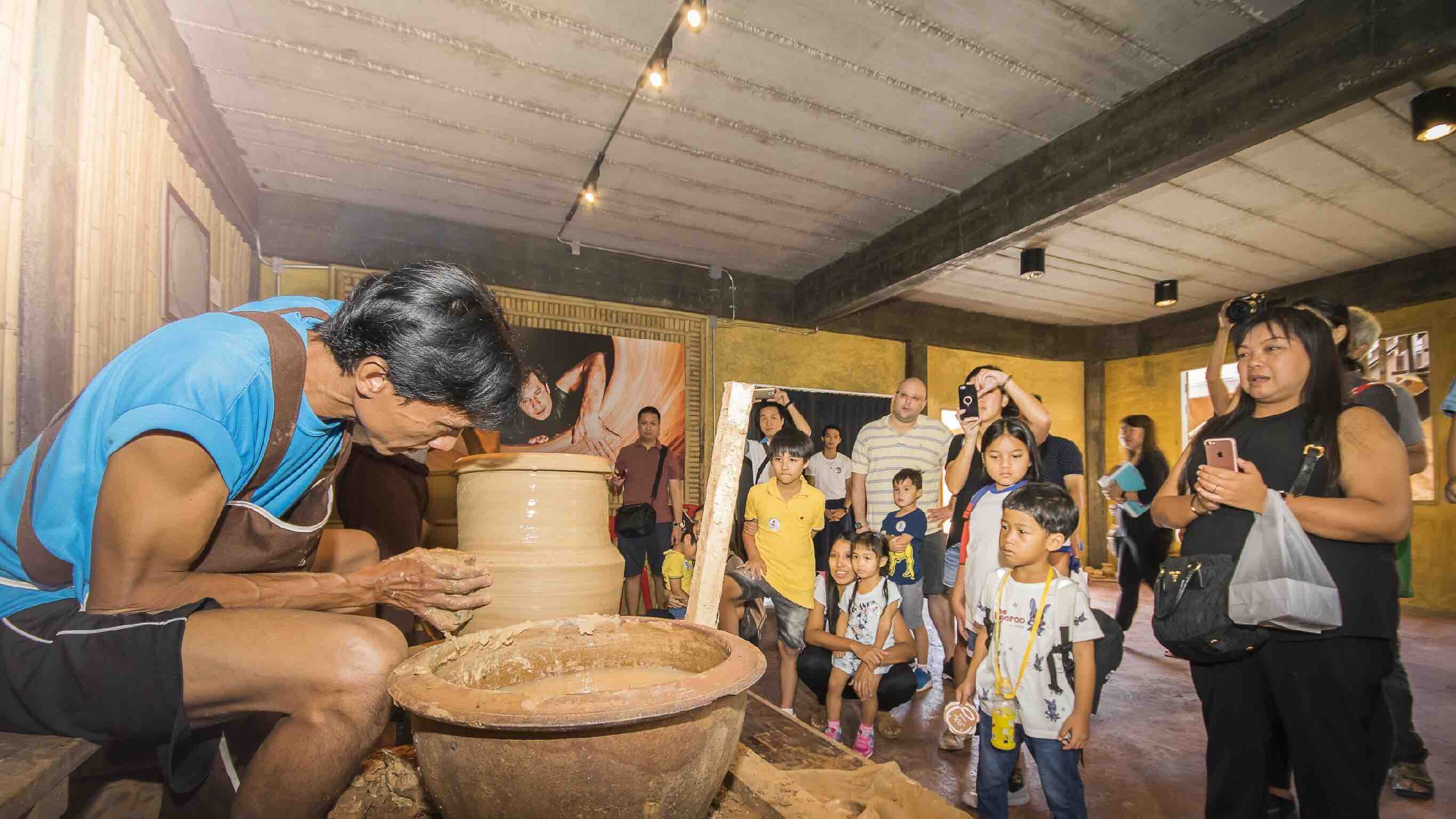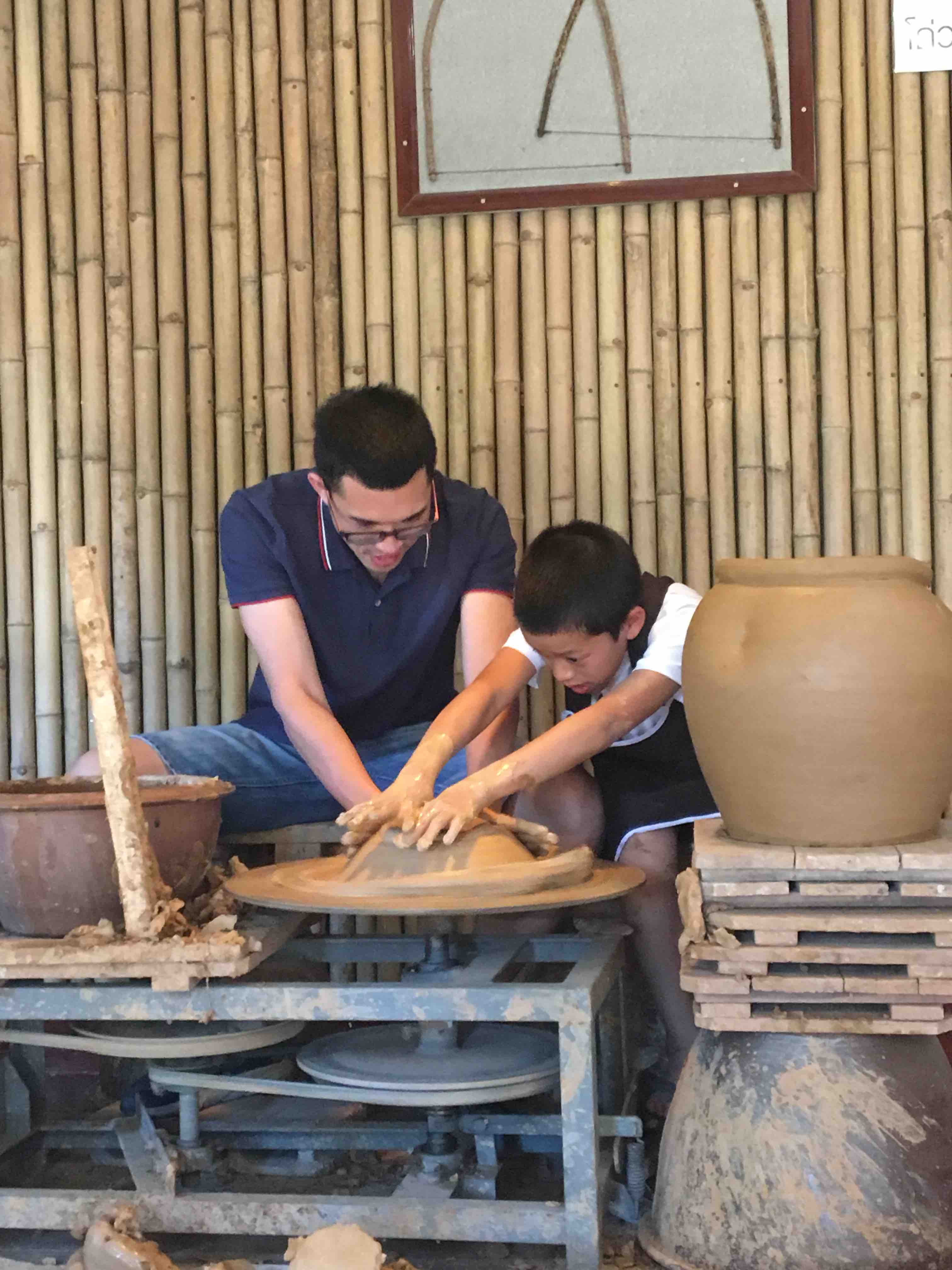 สาธิตวิธีปั้นโอ่งจากดินเหนียว อันนี้เป็นเครื่องปั้นดินเผาขนาดเล็ก หรือโอ่งป๊อกล็อก เป็นที่สนใจสำหรับเด็กและผู้ใหญ่ ทั้งไทยและเทศค่ะ