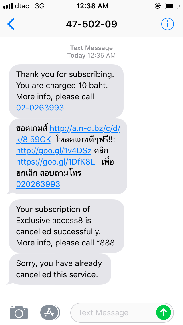 ตัวผมได้กด *137 ทันทีที่ข้อความเข้า แต่ก็ไม่ช่วยอะไร เพราะขึ้นยอดใช้งานเพิ่มไปแล้วอีก 10บาทอย่างไร้ประโยชน์