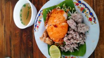 3. ก๋วยเตี๋ยวแบ เส้นเล็กลวกวางบนใบตอง โปะหมู 3 อย่าง กากหมู ราดน้ำปรุงรส ถั่วคั่ว ... สรุปก๋วยเตี๋ยวแห้ง และให้เยอะเช่นเดิม