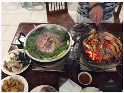 ถึงเวลาอาหารเย็นค่ะ วันนี้เราลองปิ้งย่างค่ะ หมูกระทะนั่นเอง เราเลือกร้านกุ้งกระทะค่ะเพราะได้ใบปริวมาตอนก่อนขึ้นเรือ อยากกินกุ้งย่าง ที่นี่มีกุ้งเป็นๆในถังใหญ่หน้าร้านในช้อนกันได้ตามสะดวกเลยค่ะ เค้าเท่ใส่ถังไว้เยอะมากๆไม่ได้ทยอยเอามาใส่ทีละน้อยๆเหมือนบางร้าน มาทีก็วิ่งไปแย่งกันตักที หอยหวานก็สดมากค่ะ