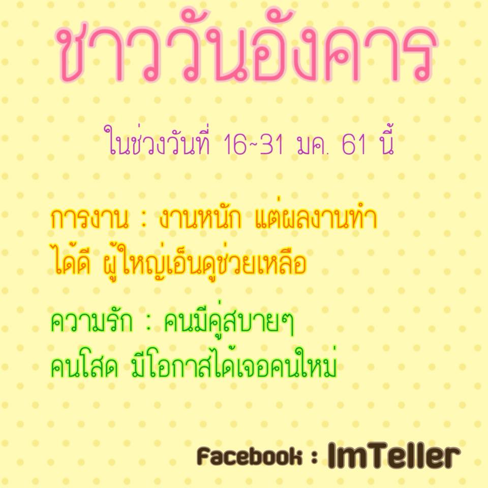 การงาน : ช่วงนี้ตึงเครียดอยากจะพัฒนาต่อยอดฝีมือและแนวคิดแต่เหมือนกับเจอทางตันใจเย็นเข้าไว้นะครับสถานการณ์จะกลับมาดีในช่วงปลายเดือน อ๋อ แล้วก็ระวังโรคที่เกี่ยวกับความเครียด เช่น ไมเกรน รวมถึง อาการนอนหลับพักผ่อนไม่เพียงพอ ด้วยนะครับ