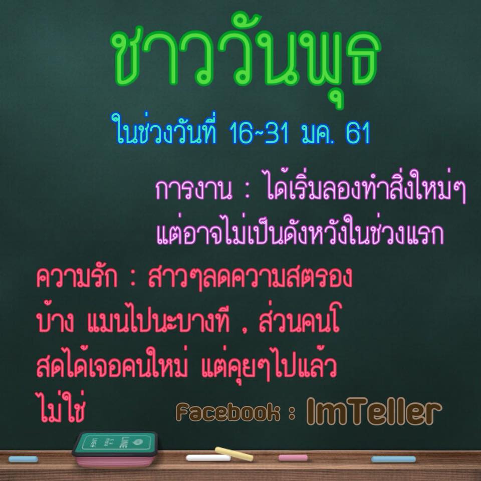 การงาน : ดูเหมือนกับว่าช่วงนี้เช้าวันพุธ และหากว่าที่เป็นคุณผู้หญิงนั้น จะได้ลองริเริ่มงานใหม่ซึ่งมีความน่าท้าทายและด้วยความที่คุณมั่นใจว่าคุณเองก็เป็นผู้หญิงที่เก่งเรื่องแค่นี้ฉันทำได้ แต่พอลงมือทำไปแล้ว ดันไม่เป็นไปตามที่คิดเสียนี่!