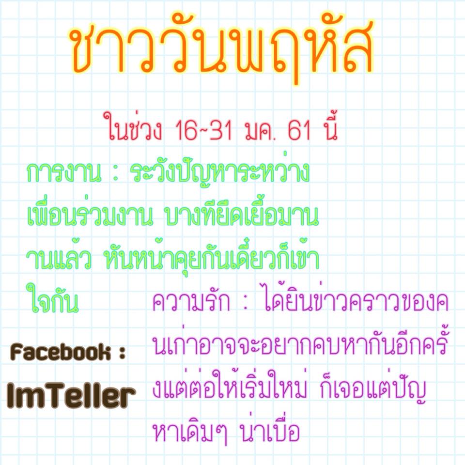 การงาน : ช่วงนี้การงานของชาววันพฤหัสไม่ได้หนักหนาอะไรนะแต่อยากจะให้ระวังความสัมพันธ์กับเพื่อนร่วมงานเสียมากกว่าและบางทีปัญหาที่เกิดขึ้นอาจจะยืดเยื้อมานาน ไม่ถูกแก้ไขสักที หากพูดคุยกันอย่างตรงไปตรงมาจะทำให้แก้ไขปัญหาและทำให้สถานการณ์ดีขึ้นได้ครับ