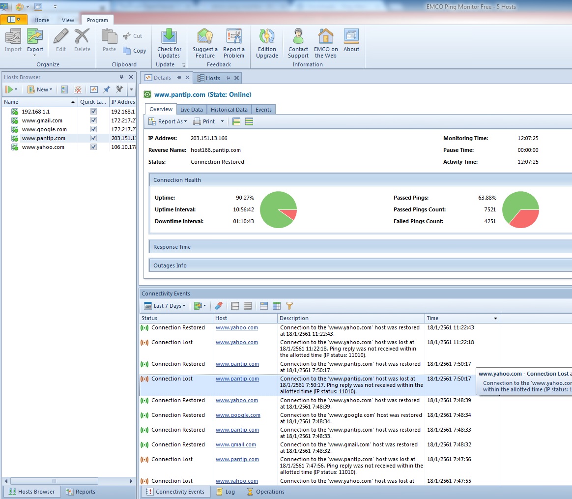 ใช้ emco เก็บข้อมูลการ ping ล่มครั้งสุดท้ายที่7.50.17 แล้วมาอีกครั้งเดียวที่11.22.18