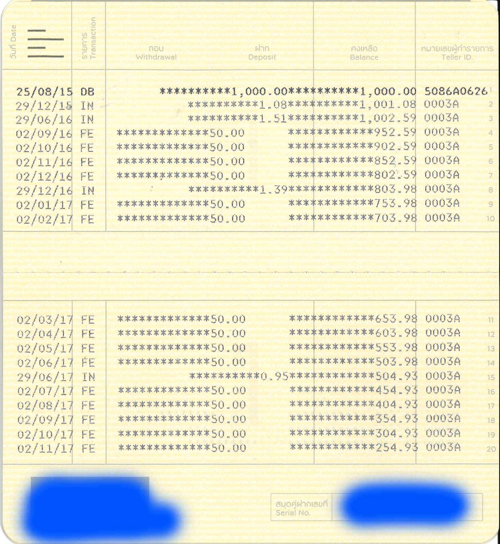 สรุปคือโดนหัก 50 บาทต่อเดือนไปเรื่อยๆ รัวๆ จากเงินต้น 1,000 บาทเหลืออยู่ 150 บาท (โดนหักไป 850 บาท!!!) ผมก็งงเลยเกิดอะไรขึ้น เมื่อกี้พึ่งถามพนง.ที่เค้าเตอร์และได้คำตอบว่า 1,000 ไม่ต้องเสียค่าธรรมเนียมรักษา account นิ ผมจึงเปิดเล่มของผมเทียบดูว่าของผมไม่เห็นเสียค่าธรรมเนียมเลย ซึ่งผมเข้าใจว่าเพราะกองทุน LTF ที่ผมซื้อนั้นมีจ่ายปันผลเป็นระยะ ทำให้มี movement ไม่เสียค่าธรรมเนียม แต่ว่ายังไงก็ฝากเกิน 1,000 บาทอยู่นินา มันต้องมีอะไรละ จึงเดินกลับไปที่ธนาคารเพื่อสอบถาม
