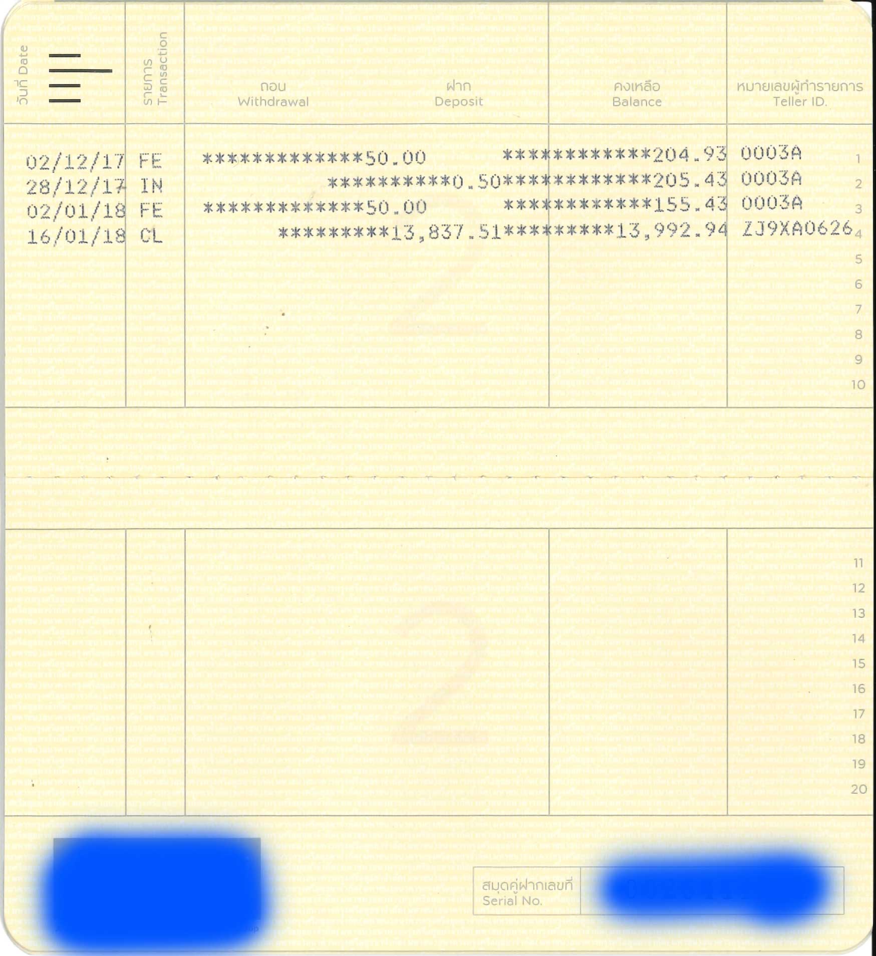 ผมกับแฟนได้คิวคนละเค้าเตอร์กัน ก่อนถอนเงินผมได้ถามพนง.ที่เค้าเตอร์ว่าถ้าไม่มียอด movement เลยเป็นปีต้องเหลือเงินในเล่มเท่าไหร่เพื่อที่จะไม่โดนหักเงินออกจากเล่ม ทางพนง.ที่เค้าเตอร์หันไปถามพนง.อีกคนนึงซึ่งได้รับคำตอบมาว่า "ต้องเหลือขั้นต่ำ 1,000 บาทค่ะ แต่ว่าถ้าไม่มี movement ภายใน 1 ปีจะโดนล็อค account นะคะ" ซึ่งทางผมไม่ได้มีปัญหาอะไรเพราะออมทรัพย์เล่มนี้ผมกะเปิดไว้เฉพาะการซื้อ LTF ซึ่ง 5 ปีมันจะมี movement ทีอยู่แล้วค่อยมาทำเรื่อง unlock ในอนาคตตอนขายอีกทีเอาก็ได้ (จากที่พนง.เคยบอกผมไว้ตอนผมจะซื้อ LTF ตั้งแต่เมื่อ 5 ปีที่แล้วว่าจะต้องมีเล่มออมทรัพย์ประกอบ)