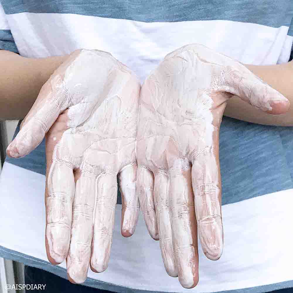 เนื้อสัมผัสจะประมาณนี้เลยค่ะ ถ้าใส่น้ำมากก็จะช่วยให้ถูหน้าง่ายขึ้นและมีฟองมากขึ้น
