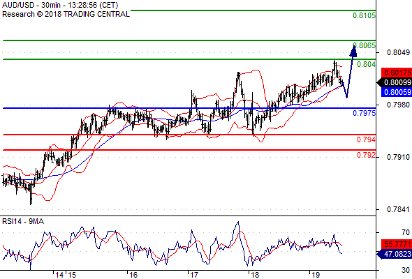 จุดที่ต้องการ: สถานะซื้อสูงกว่า 0.7975 เป้าหมายต่อไปที่ 0.8040 และ 0.8065