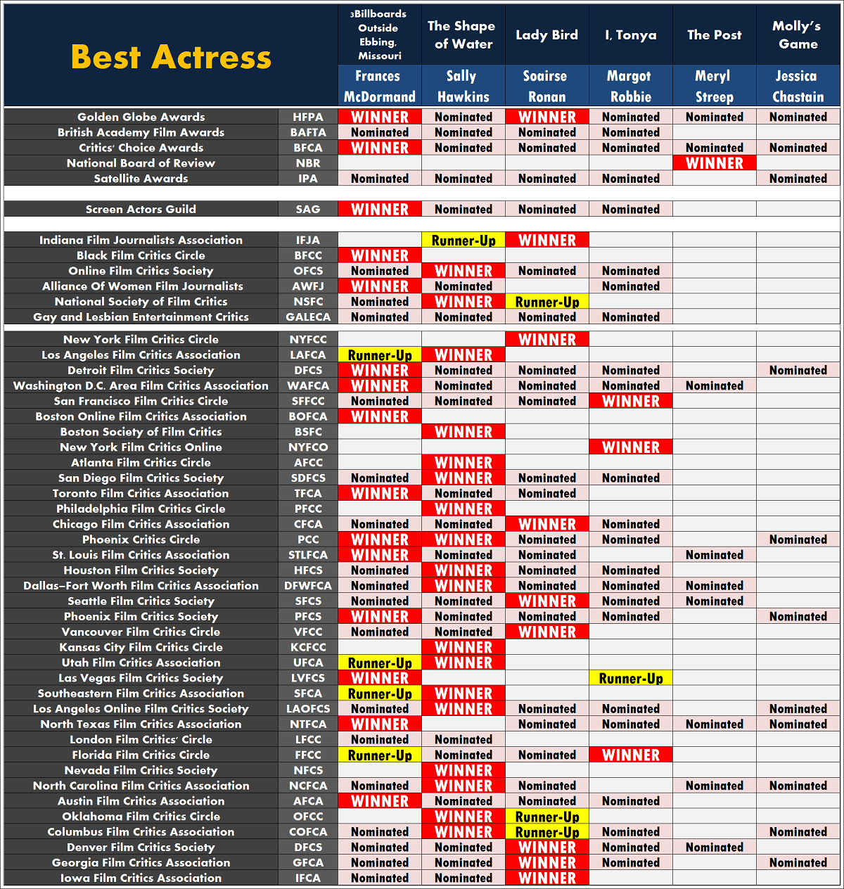 ซึ่งจากผลรางวัลสถาบันใหญ่ๆที่ผ่านมา ผลออกมาคือ Frances McDormand กวาดเรียบทั้ง ลูกโลกทองคำ, Critics Choice Awards และ SAG Awards