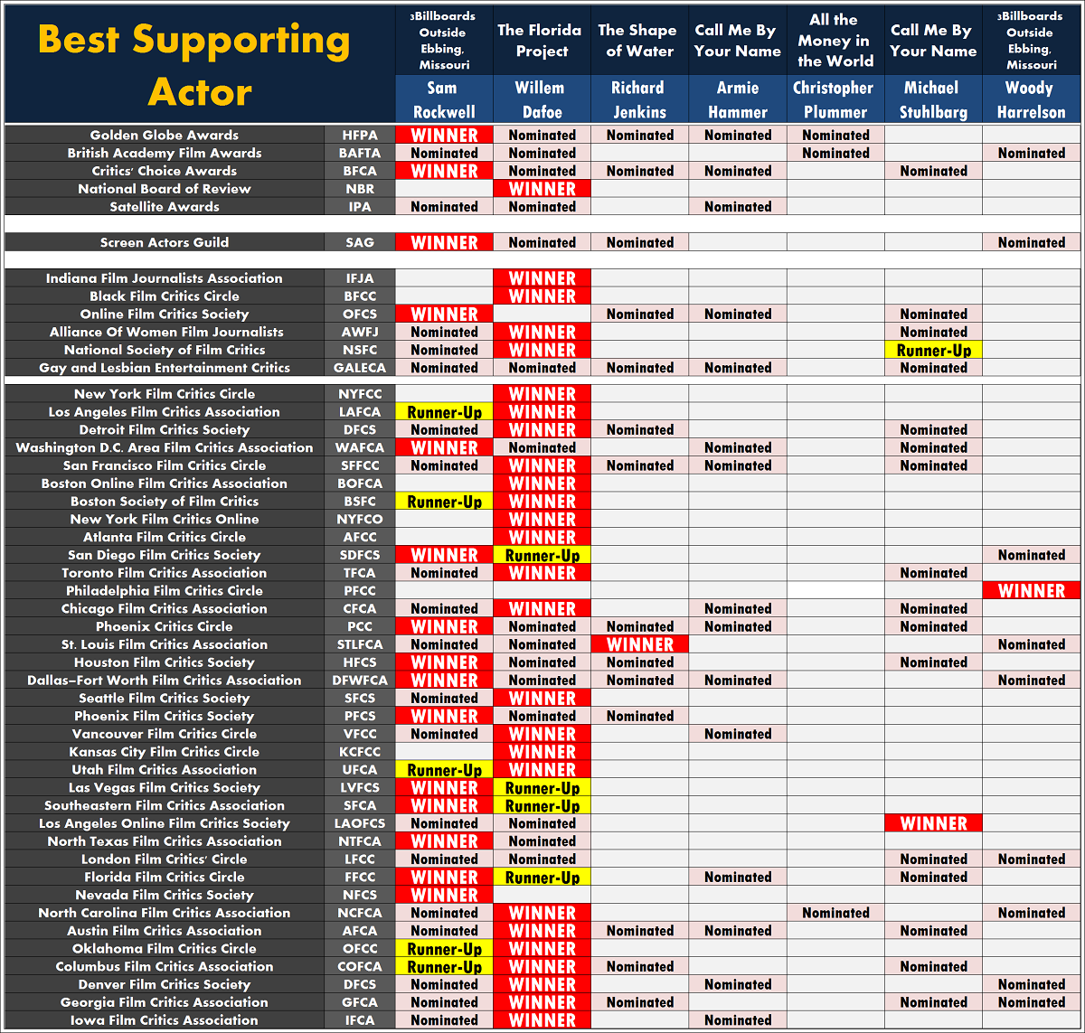 สถาบันวิจารณ์หนัง เทใจให้ Willem Dafoe จากเรื่อง The Florida Project เคียงคู่กับมวยรองอย่าง Sam Rockwell จาก Three Billboards Outside Ebbing, Missouri แต่พอมาสถาบันใหญ่ๆ ปรากฏว่าเป็น Sam Rockwell ที่กวาดรางวัลเรียบเช่นกันทั้ง ลูกโลกทองคำ, Critics Choice Awards และ SAG Awards ในขณะที่ทั้ง Willem Dafoe และหนัง The Florida Project โดนเทแทบไม่ได้เข้าชิงรางวัลใหญ่ หรือจากสมาคมวิชาชีพเลย