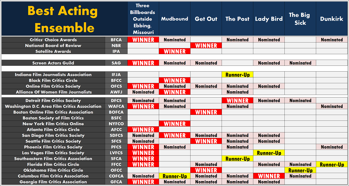 ถึงแม้ในออสการ์จะไม่มีสาขานี้ แต่ก็ต้องติดตาม เพราะกรรมการโหวตออสการ์ในสายการแสดงมีจำนวนเยอะมากเมื่อเทียบกับสายอื่นๆ ซึ่งในสายการแสดง เรื่อง Three Billboards Outside Ebbing, Missouri ถือเป็นหนังที่มีทีมนักแสดงยอดเยี่ยมถูกใจเหล่ากรรมการมากที่สุดในปีนี้ โดยกวาดรางวัลมาทั้ง Critics Choice Awards และ SAG Awards