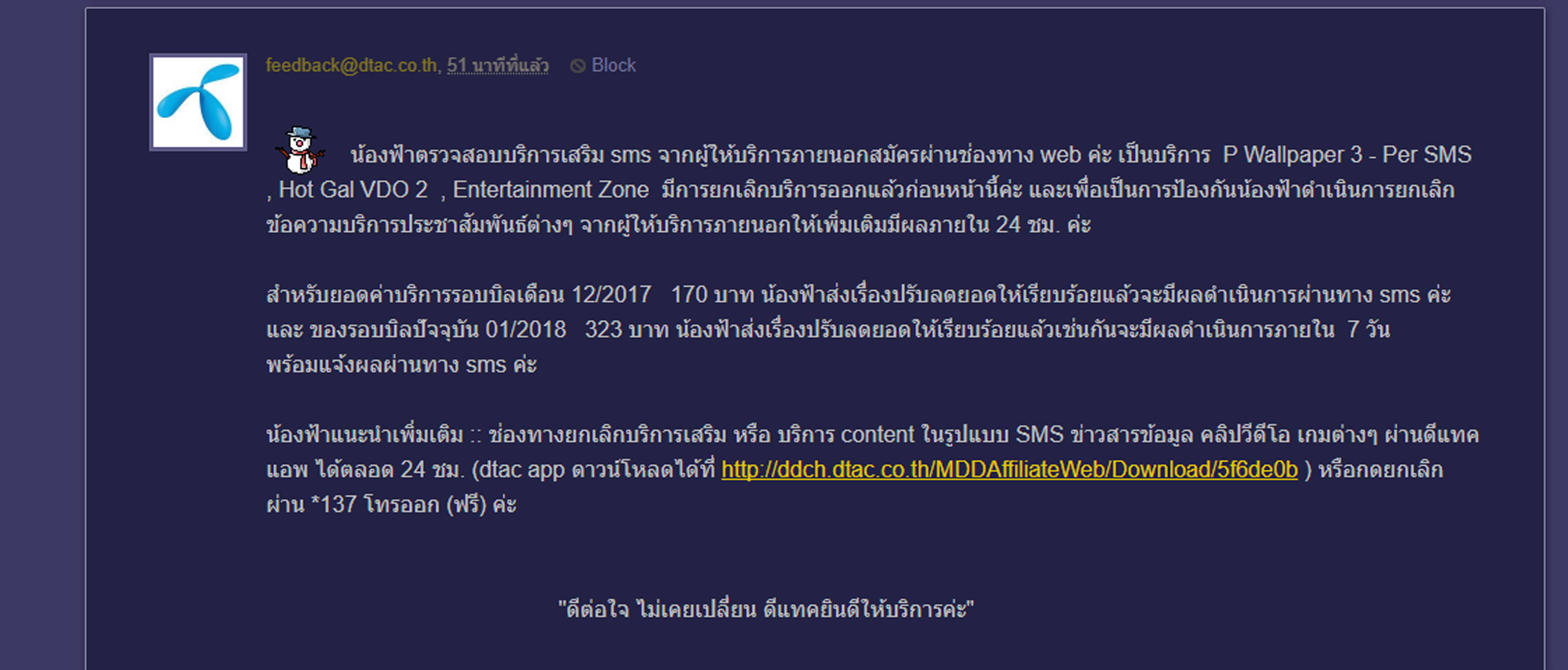 ที่ไหนได้พอสิ้นเดือนมียอดมา300กว่าบาทท ทำไงได้บ้างครับ โทรถามคอลเซนเตอร์ก็ไม่ได้ความ บอกว่าผมสมัคร ทั้งๆที่มันส่งมาเอง