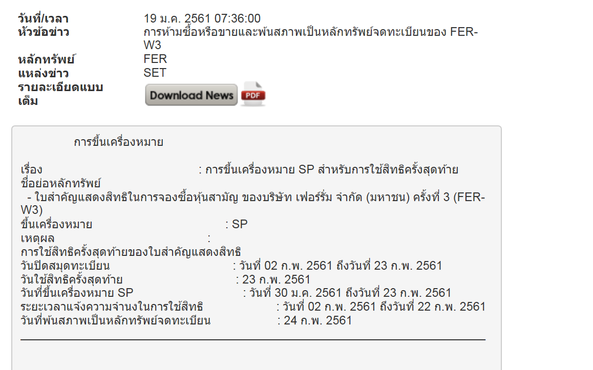 FER-W3 : ซื้อขายวันสุดท้าย 29/1/2561
