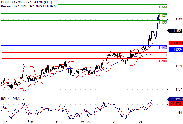 จุดที่ต้องการ: สถานะซื้อสูงกว่า 1.4050 เป้าหมายต่อไปที่ 1.4220 และ 1.4270
