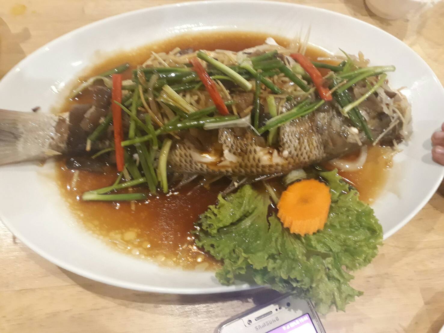 ขับรถมาจากตัวเมืองภูเก็ต  เพื่อมากินอาหารทะเลที่หาดราไวย์ ระยะทางก็ไม่ไกล  แต่รถติดมาก ใช้เวลาเกือบชั่วโมง ในการเดินทางพอมาถึงก็เลือกร้านมุขมณี สาขา 2  ตั้งอยู่ที่ด้านนอกติดกับลานจอดรถ ซึ่งเป็นร้านประจำที่กินร้านนี้บ่อยมาก  นำเอาวัตถุดิบไปให้ร้านชั่งกิโลบอกราคา  แล้วเราก็บอกเมนูที่จะทำ  3  อย่าง   ปลาตะมะ นำมานึ่งซีอิ่ว  กุ้งขาวนำมาอบชีส ส่วน ไข่ปลานำมาทำแกงส้มผักรวม   มาดูเมนูแรกครับ ปลาตะมะนึ่งซีอิ้ว  อร่ิยมาก เนื้อปลาขาวอร่อยสด นึ่งกับซีอิ้วหอมเหล้าจีน