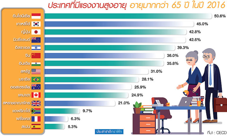 [Spoil] คลิกเพื่อดูข้อความที่ซ่อนไว้ประเทศไทยเป็นประเทศที่มีสัดส่วนผู้สูงอายุมากเป็นอันดับสองของอาเซียนรองจากสิงคโปร์ และสถิติจากทั่วโลกพบว่า อินโดนีเซียเป็นประเทศที่มีสถิติการจ้างงานผู้สูงอายุมากที่สุดในโลก ถึง 50.6 % ตามมาด้วยเกาหลี และญี่ปุ่น