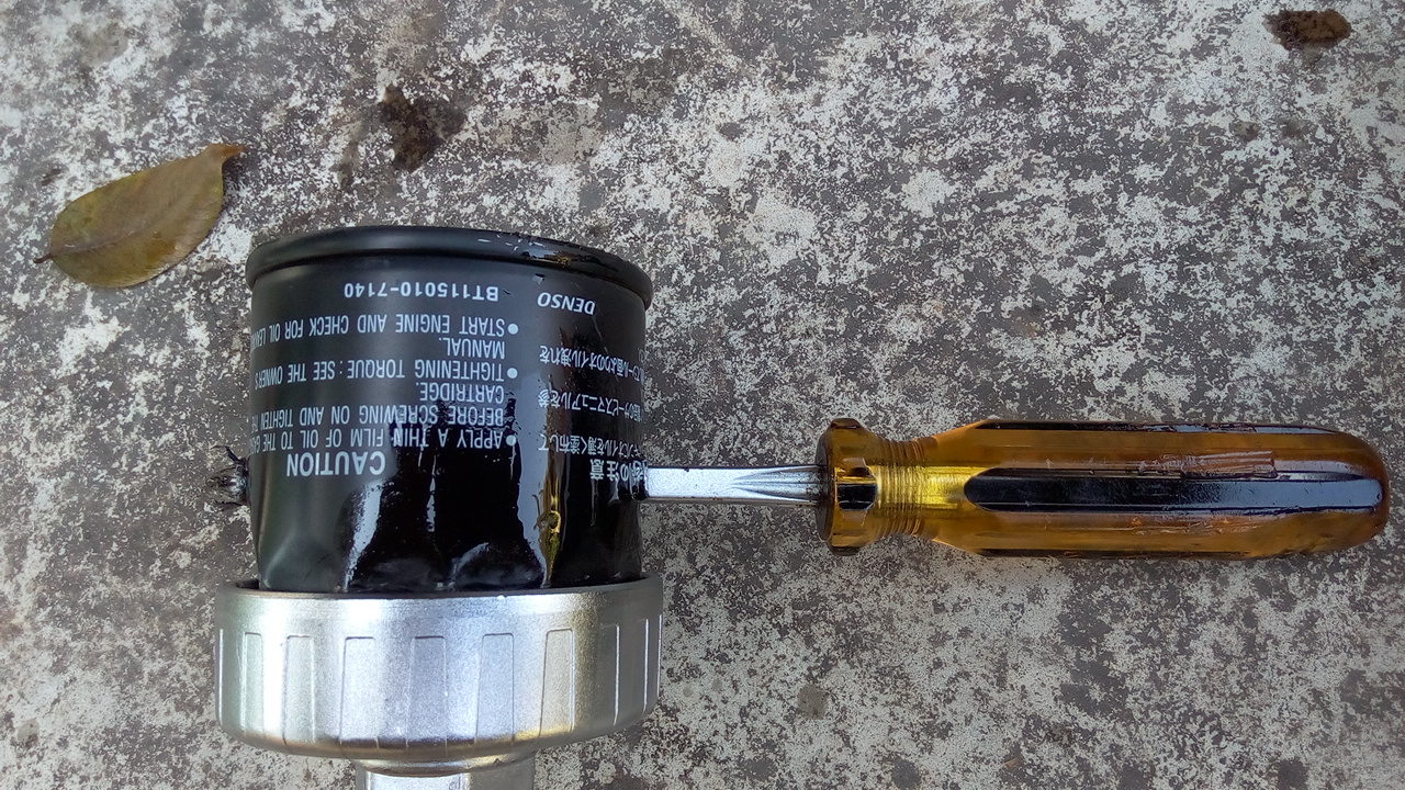 จังหวะที่เพิ่งคลายกรองเครื่องได้นิดหน่อย  ย่ามใจ เอาไขควงออก ใช้มือกำจะหมุนกรองออก