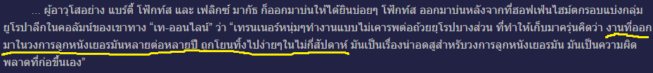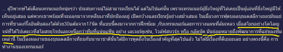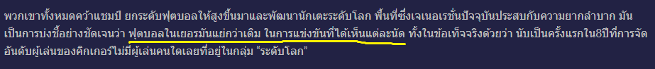 อันนี้ก็เห็นด้วย ซึ่งใจยังรับไม่ได้ แต่เมื่อลองค้นหาข้อมูลดูก็ยังพอเบาใจได้บ้าง ไม่ใช่ทีมแต่ละทีมจะไม่ปรับ แต่เป็นเหมือนการปรับจากจุดต่ำสุดขึ้นมามากกว่า สังเกตจะเห็นว่ามีนักเตะดาวรุ่ง หรือแม้แต่โค้ชดาวรุ่งก็ขึ้นมาเยอะ รวมถึงลักษณะการบริหารทีมที่เปลี่ยนไปด้วย ก็ยังมั่นใจว่า อีกไม่นาน ลีกเยอรมันจะกลับเข้ามาสู่จุดเดิมได้