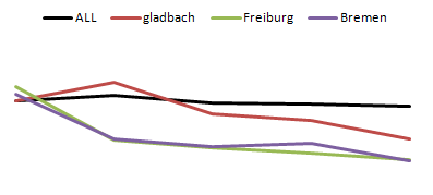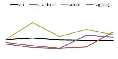 เมื่อเปรียบเทียบความแตกต่างของทั้งสองตารางนี้จะเห็นได้ว่า Mainz และ Augsburg มีฟอร์มที่โดดเด่นเกินกว่าคะแนนในตาราง ซึ่งต่างจาก Hoffenheim และ Hannover ที่มีคะแนนสูง แต่ฟอร์มการเล่นสะสมค่อนข้างจะดร๊อปลง ซึ่ง Hertha เองก็เช่นกัน