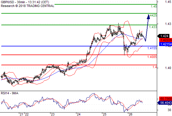 จุดที่ต้องการ: สถานะซื้อสูงกว่า 1.4155 เป้าหมายต่อไปที่ 1.4330 และ 1.4425
