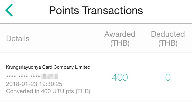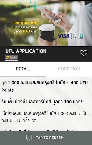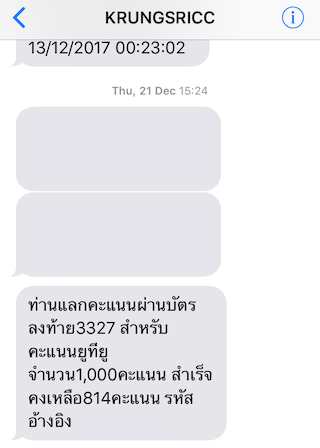 เรื่องมีอยู่ว่าไปเห็นโฆษณาของบัตรเครดิตกรุงศรีว่าแลกแต้มกรุงศรีพันนึง จะได้แต้ม UTU 400 แต้มและบัตร Starbucks 100 บาท เห็นแล้วไม่รอช้ารีบโหลดแอพ UTU มาลงทะเบียนหวังจะได้ใช้แต้มบัตรกรุงศรี JCB ที่สะสมมานานเสียที แต่ก็พบว่าบัตรเครดิตที่ผูกกับแอพได้มีแค่ Visa กับ Mastercard ด้วยความหน้ามืดอยากได้บัตรสตาบัคจึงลองไปทำรายการในแอพ Uchoose ดูเผื่อว่าจะทำรายการแลกได้ แล้วก็ทำได้ได้จริงๆ แลกเสร็จก็มี sms ส่งมายืนยันการทำรายการ