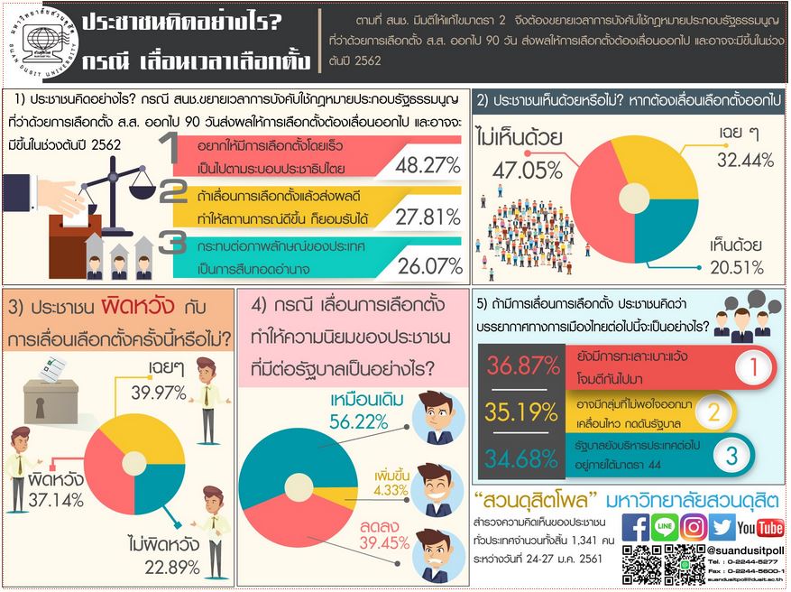"ประชาชนคิดอย่างไร กรณีเลื่อนการเลือกตั้ง "โดยทางสนช.มีมติให้แก้ไขมาตรา 2 จึงต้องขยายเวลาการบังคับใช้กฎหมายประกอบรัฐธรรมนูญที่ว่าด้วยการเลือกตั้ง ส.ส. ออกไป 90 วัน ส่งผลให้การเลือกตั้งต้องเลื่อนออกไป และอาจจะมีขึ้นในช่วงต้นปี 2562 โดยพบว่า