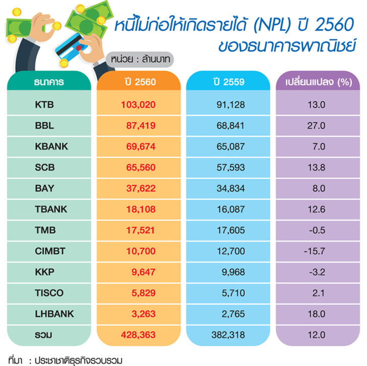 ผู้สื่อข่าวรายงานว่า จากการรวบรวมข้อมูลตัวเลขหนี้ที่ไม่ก่อให้เกิดรายได้ (เอ็นพีแอล) ของธนาคารพาณิชย์ 11 แห่ง ณ สิ้นปี 2560 (ดูตาราง) ได้แก่ ธนาคารไทยพาณิชย์ (SCB), ธนาคารกสิกรไทย (KBANK), ธนาคารกรุงเทพ (BBL), ธนาคารกรุงศรีอยุธยา (BAY), ธนาคารกรุงไทย (KTB), ธนาคารทหารไทย (TMB), ธนาคารทิสโก้ (TISCO), ธนาคารเกียรตินาคิน (KKP), ธนาคารแลนด์ แอนด์ เฮ้าส์ (LHBANK), ธนาคารซีไอเอ็มบีไทย (CIMBT) และธนาคารธนชาต (TBANK) พบว่า มียอดเอ็นพีแอลรวม เพิ่มขึ้น 12%