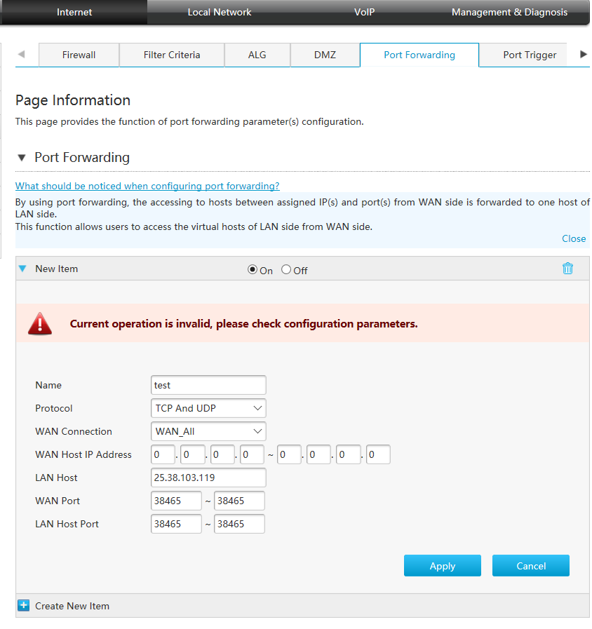 AIS fiber ZXHN H298A port forward ไม่ได้ขึ้น Current operation is invalis,please check configuration paramrters.