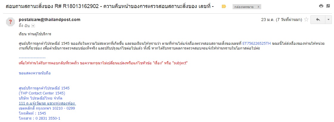 ทาง ไปรษณีย์แจ้งกลับมาวันที่ 25 ตามรูปที่แนบมา แล้วก็เงียบไปเลย