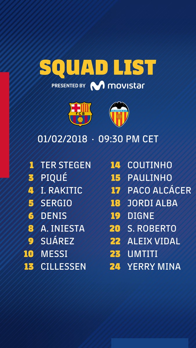 คลิปซ้อมเมื่อวานนี้ https://youtu.be/QrV4uOsbH8c รายชื่อสิบแปดคนที่จะเดินทางไปวันนี้ ราฟินญ่าเข้ามาแทนดีญ ที่เห็นว่ามีอาการน็อคที่เข่าจากนัดเจอเบติส ทั้งบุสเกต