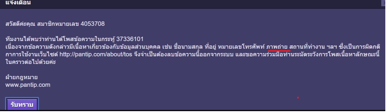 สวัสดีค่ะ WM ป้ากด "รับทราบ" ตามความต้องการของคุณแล้วนะคะ แต่ยังยืนยันว่าทู้นั้นป้าไม่ได้ด่าใครโดยจงใจหรือไม่ก็ตาม แต่ถ้าหากมีคอมเม้นท์ใดของเพื่อนป้าทำให้อาจเข้าข่ายเนื้อหาผิดกฎหมาย