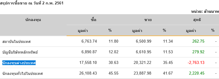 Sinthorn Summary 2/2/2561 : ต่างชาติขายสุทธิ -2,763.13 ลบ.