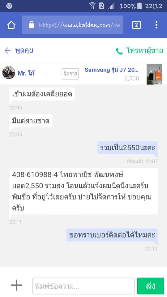 เมื่อต้นเดือนมกราคมที่ผ่านมาเราได้ตัดสินใจซื้อมือถือผ่านเว็บนึง เนื่องจากมือถือเครื่องเก่าเราพัง และเราเองก็ต้องการมือถือดีๆแต่ราคาไม่แพงมากเพราะเรามีเงินในมือไม่เยอะ พอมีมือถือที่อยากมาลงขายเราก็ติดต่อเขาไปเขาบอกว่าขายแล้ว ก็เลยทักไปหาคนใหม่เขาก็บอกว่าติดจอง เราก็เลยเปิดเว็บนี้เรื่อยๆเผื่อจะมีมือถือที่อยากได้แต่ราคาเบาๆมาลงขายอีก เลื่อนไปเรื่อยๆเราก็เจอมือถือของซัมซุง J7 prime เราสนใจก็เลยทักไปถาม เราบอกของยังมีอยู่ อุปกรณ์มีสายชาร์ตอย่างเดียว เราก็เลยขอเบอร์ติดต่อเขาไว้ พอเอาเบอร์ไปค้นหาในไลน์ก็พบว่าบุคคลนั้นมีตัวตนอยู่จิงเราก็เลยโอนเงินไปให้ รวมค่าส่งก็ 2550บาท ผ่านไปหลายวันเราก็ยังไม่ได้ของ ครบอาทิตย์แล้วของก็ยังไม่มาส่ง เราก็เลยเข้าไปดูข้อมูลเก่าๆกะว่าจะทักถามแต่แชทถูกลบ โทรไปก็ไม่ติด ทักไลน์ไปก็ไม่ตอบ ซึ่งจากทั้งหมดก็ชัดมากๆว่าถูกหรอกแล้ว