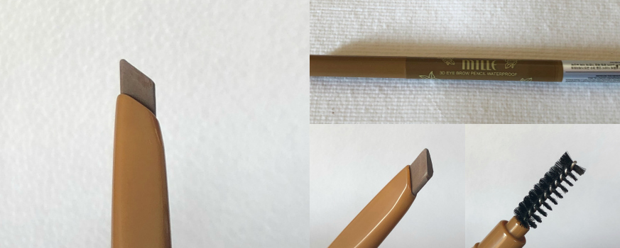 เป็นครั้งแรกที่ลองซื้อมาลองกับที่เขียนคิ้วของ Mille หัวดินสอเป็นทรงตัดปลายเฉียง รูปทรงสามเหลี่ยม เนื้อดินสอจะออกแข็งๆหน่อยแต่พอลองเขียนจริงดีค่ะ แต่ถ้าอยากเก็บรายละเอียดเล็กๆอาจไม่ค่อยได้ดั่งใจนะ ที่ชอบก็คงจะเป็นสีเพราะดูธรรมชาติๆ ใสๆค่ะ อิอิ
