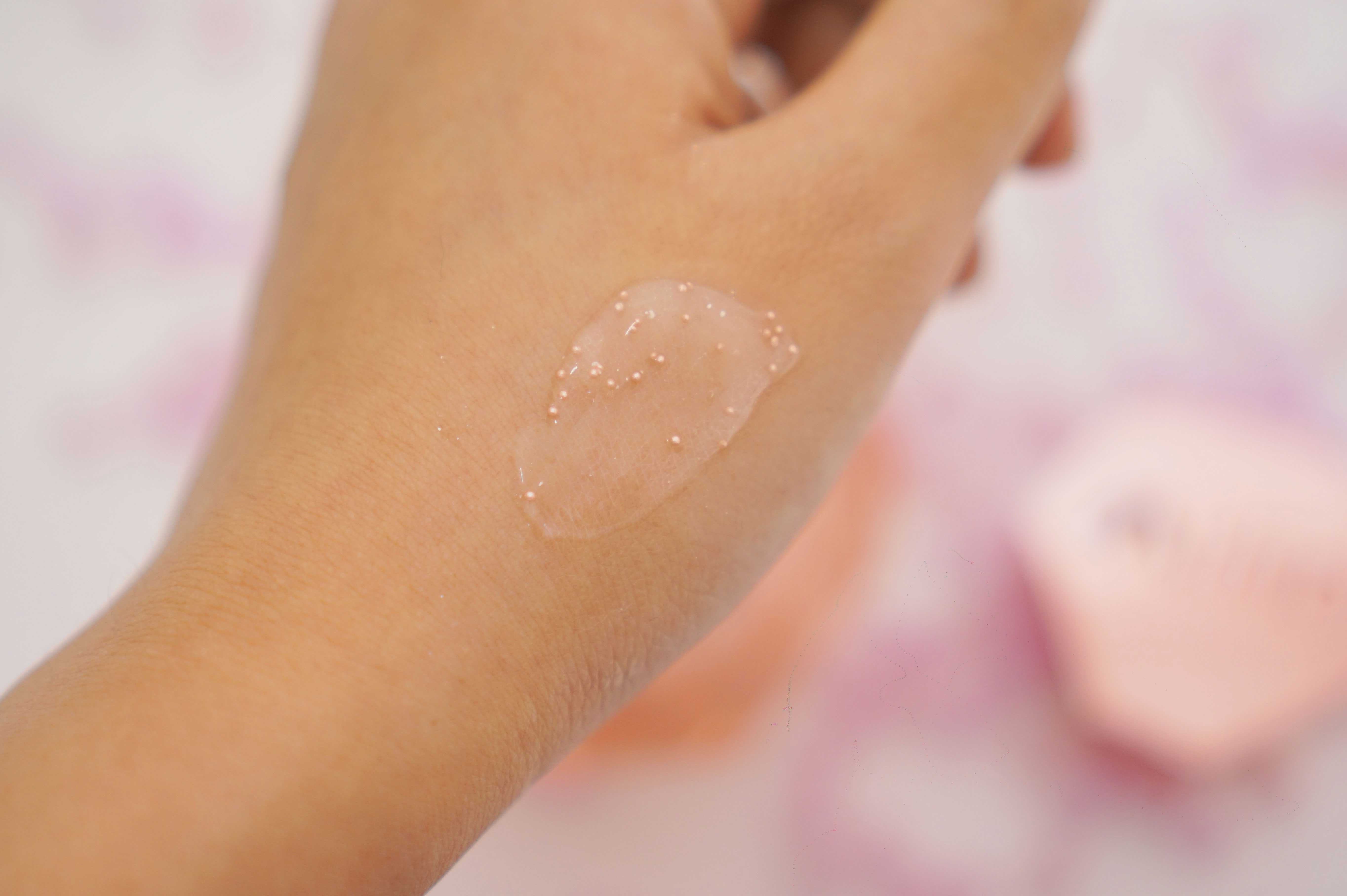 2.นำมาวอมที่หลังมือเพื่อให้เม็ดบีดเล็กๆสีชมพูแตกเป็นเนื้อเดียวกับเอสเซนต์