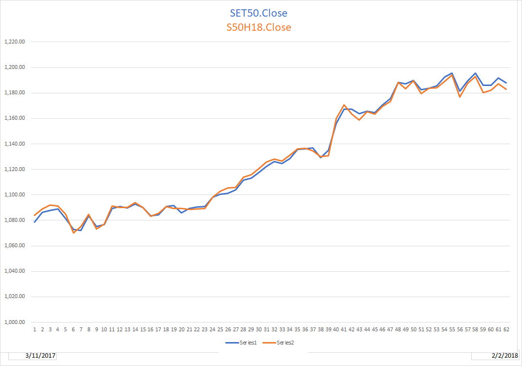 ผมเลยเอาข้อมูล TFEX S50H18.High กับ SET50.Close มา Compare กันดูปรากฏว่าเป็นดังรูป